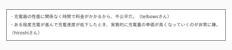 充電量ではなく充電時間で課金されることが多い現在の充電料金。不満を持っている方も多く、「従量課金制」を望む声もあります。少しずつ従量課金制の充電器も出てきており、今後の動きに注目です。