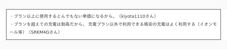 「契約プラン内で使える分のみ利用する」と回答した18%の方々は、プラン内の価格とプランを超えての価格を比較し、その価格差の大きさから、契約プラン以上に充電することを控えているようです。PHEVの場合は、ガソリン代と比較し、プランを超えた分はガソリンで補うという方も。