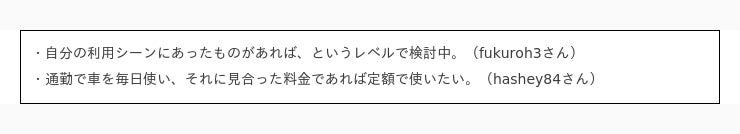 そのほか、仕組みがわかりづらい、場所を限定されると使いづらいなど、定額プランの内容から契約しないという判断をしている方もいらっしゃいました。また、どんなプランがあるのか知らないという声も複数上がりました。