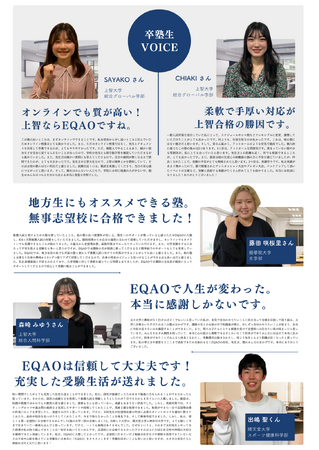 中・高校時代、バスケットボール部に所属。高校1年の時には、カナダに1年留学し、帰国後は、数々の実地調査を経て、移民の受け入れ体制について英語で論文を執筆。英語資格は、IELTS6.5、英検準1級を取得。成績は評定平均4.6を維持。その他にも、英語プレゼン大会近畿優勝、複数の政治家への取材、ボランティア委員会委員長としての活動など、多岐に渡る活動を武器にAO入試を利用して受験に挑むも、見事に惨敗。5校から不合格をいただいた。AO入試において強いとされる実績を数多く持ちながらも、不合格だったことを疑問視し、AO入試について研究を開始。そこで発見した「必敗法」を踏まえて、書類を全て書き直し出願したところ、上智大学をはじめとする難関私大3校に合格。この経験から、18歳の時にEQAOの前身であるAO入試専門塾ONLINE AOを緊急事態宣言中に起業。19歳の時には、リラクゼーション事業を立ち上げ、2023年に事業譲渡。20歳の時には、浜松町にEQAO本校舎/オンライン校を設立。「すきを見つけて、すきを伸ばす」という教育理念を胸に、挑戦を恐れず、未来ある子ども達の成長に人生を捧げたい。
