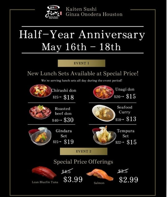 「廻転鮨 銀座おのでら ヒューストン店」オープン半年記念祭 第1弾内容