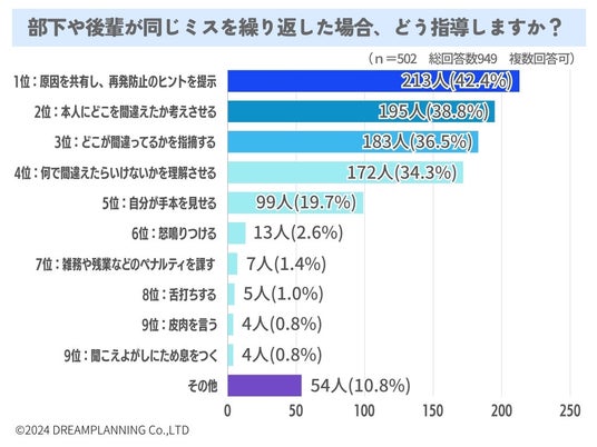 部下や後輩が同じミスを繰り返した場合、どう指導しますか? n=502 回答949 複数回答可