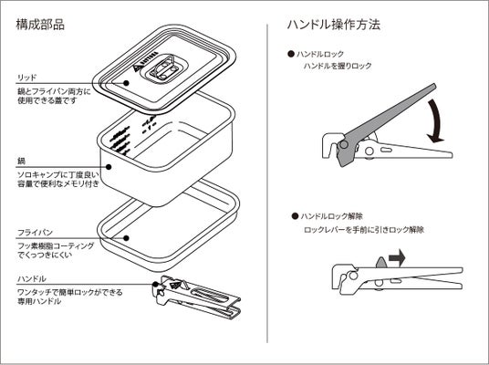 簡単に脱着可能なワンタッチロック機構付きハンドル、焦げ付き防止加工を施したフライパン、そしてハードアルマイト加工を施した鍋とリッドがセットになったソロキャンプに最適な基本調理セットです。