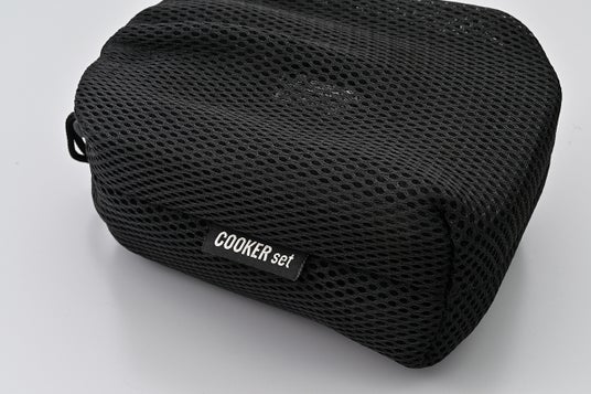 ソロキャンにピッタリな鍋、フライパン、リッド、ハンドルの基本セット。コンパクトに持ち運べるメッシュの収納袋付きのクッカーです。ハンドル専用の収納袋もついております。