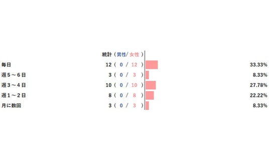 次に「どのくらいの頻度で運動を行っていますか?」とアンケート調査をした結果、1位は『毎日』でした。1位:毎日2位:週3~4日3位:週1~2日4位:週5~6日5位:月に数回──────────────────────────────