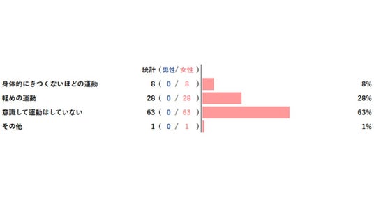 ──────────────────────────────今回のアンケートで「ご自身が健康だと感じていますか?」とアンケート調査をした結果、1位は『どちらかというと健康である』でした。また、「意識的に運動をしていますか?」の回答の1位は『意識して運動はしていない』でした。次に「どのくらいの頻度で運動を行っていますか?」の回答の1位は『毎日』でした。ただし、よく言われるのが「多くの人が自分の健康状態を過大評価している」そうです。