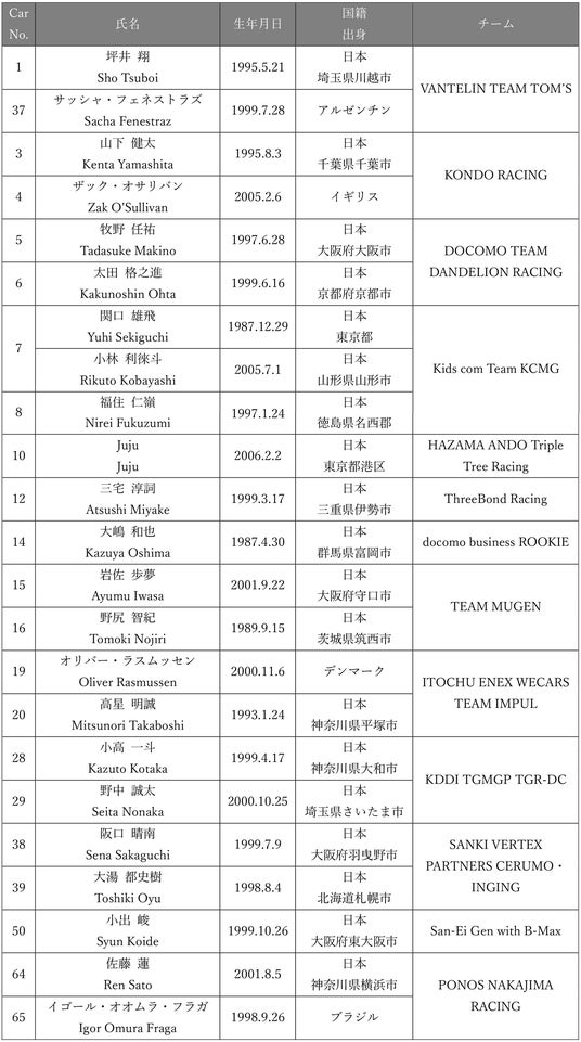 2025 SUPER FORMULA 第2回公式テスト エントリーリスト