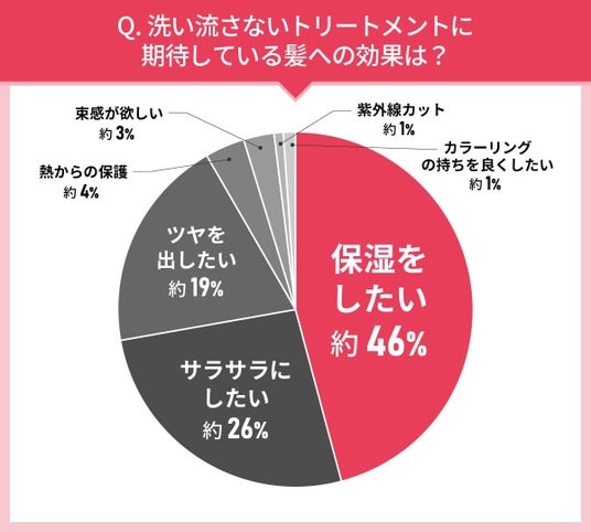 「保湿をしたい」が約46%と、半数近くを占めました。次いで「サラサラにしたい」が約26%、「ツヤを出したい」が約19%、その他「束感が欲しい」など、質感の変化を期待する人も多いようです。また、「熱からの保護」「紫外線カット」など、洗い流さないトリートメントにさまざまな効果を期待していることもわかりました。