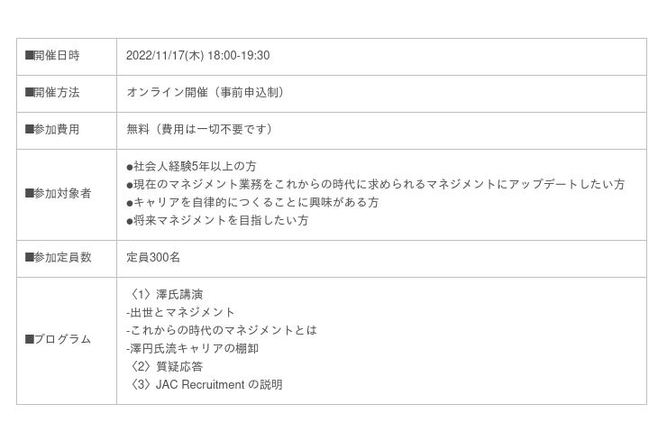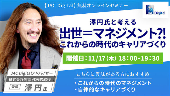 世界11ヵ国で人材紹介事業を展開する業界大手の株式会社 ジェイ エイ シー リクルートメント(代表取締役会長兼社長:田崎 ひろみ、本社:東京都千代田区)は、「澤円氏と考える 出世=マネジメント?! これからの時代のキャリアづくり」と題したオンラインセミナーを11/17(木)に開催いたします。