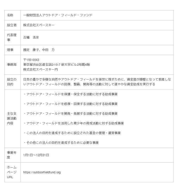 「すべての人がアウトドアレジャーをより長く豊かに楽しめる社会を創る。」をビジョンに掲げる株式会社スペースキー(本社:東京都渋谷区、代表取締役社長:佐藤祐輔、以下スペースキー)は、日本の豊かで多様な自然やアウトドア・フィールドを後世に残すために、損傷したアウトドア・フィールドの回復や新たに整備・開発されるフィールドにおいて、資金面が障壁となって前進しない活動等に対し、速やかに資金助成が実行されることを目的として、「一般財団法人アウトドア・フィールド・ファンド」を設立いたしました。