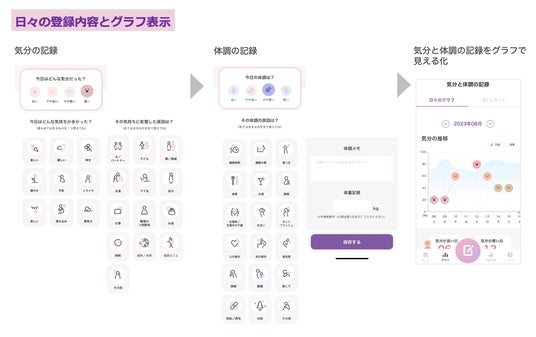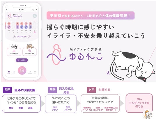 弊社が提供する更年期女性むけ健康管理サービス「ゆるれこ」は、自身の心と体の状態を記録し、その状態をグラフで可視化。グラフから今の自分の状態や傾向の把握ができたり、入力内容によって適切なケアメッセージを配信するなど、不調なタイミングでも無理なく過ごすためのアドバイスなどを届けながら10年と言われる更年期を健やかに過ごせるようサポートするサービスです。