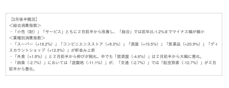 本日、「JCB消費NOW」の2月下旬(2月16日~2月29日)の国内消費動向の速報データの一部を公開致します。