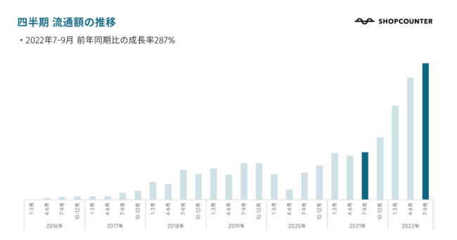株式会社COUNTER WORKS(東京都目黒区、代表取締役CEO:三瓶直樹)が提供する商業不動産のマーケットプレイス「SHOPCOUNTER(ショップカウンター)」の2022年7-9月の流通額が前年同期比287%、前四半期比112%となり、5Q連続で最高値を更新しました。