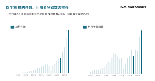併せて、流通額以外の重要KPI指標として、プラットフォームを通じて出店場所への予約と決済完了値を示す「成約件数」は前年同期比で460%、「SHOPCOUNTER」の利用者登録数は前年同期比で253%と、大きく増加しております。