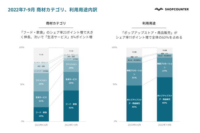全体を押し上げた要因として、掲載スペース数の継続的な増加、首都圏をはじめ関西また九州などの利用ユーザーのエリア拡大に加え、テナントのジャンル拡大が挙げられ、中でもキッチンカーや食物販の「フード・飲料」が前四半期と比較してシェア率23ポイント増と大きく伸長、次いで携帯キャリア・買取・保険などの「生活サービス」が4ポイント増となりました。また利用用途は「ポップアップストア・商品販売」がシェア率11ポイント増で全体の60%と大きな割合を占めております。