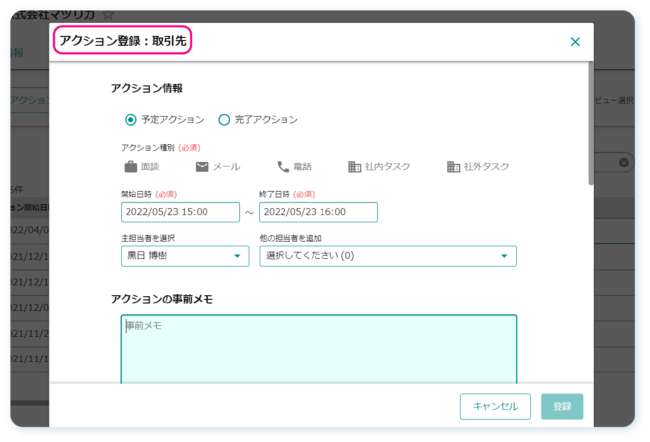 いままでアクションの対象は案件とコンタクトのみでしたが、今回のリリースによって取引先に紐付けることが可能になりました。