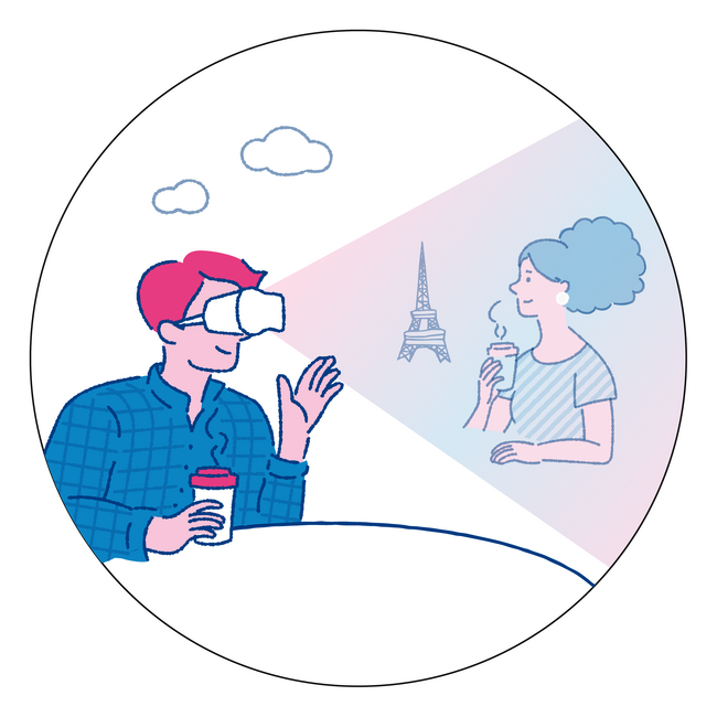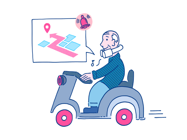 スマートフォン等の画面を見ずに、視覚的に見えている周りの景色上に目印(ランドマーク)を設定し、それを元に音声情報を用い、スマートフォンのGPS情報なども用いながら無人でナビゲーション&ガイドをしていくサービスです。