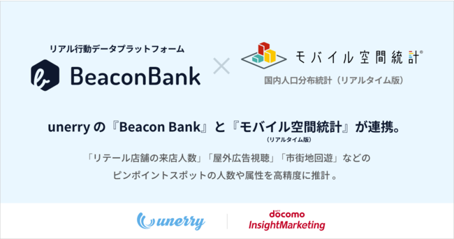 株式会社unerry(東京都港区:代表取締役CEO 内山英俊)の運営するリアル行動データプラットフォーム「Beacon Bank(R)️」(以下、Beacon Bank)は、株式会社ドコモ・インサイトマーケティング(本社:東京都豊島区、代表取締役社長:三毛孝彦)の提供する「モバイル空間統計(R)️人口分布統計(リアルタイム版)」(以下、モバイル空間統計)とのプロダクト連携を開始しました。