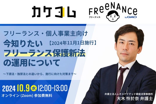 弁護士予約プラットフォームを提供する株式会社カケコム(以下、カケコム/本社所在地:東京都港区、代表取締役社長:森川照太 )は、フリーランスに特化した金融支援サービス「FREENANCE byGMO」を運営するGMOクリエイターズネットワーク株式会社(以下、GMOクリエイターズネットワーク/本社所在地:東京都渋谷区、代表取締役社長:五十島 啓人)と、共催セミナーを開催します。