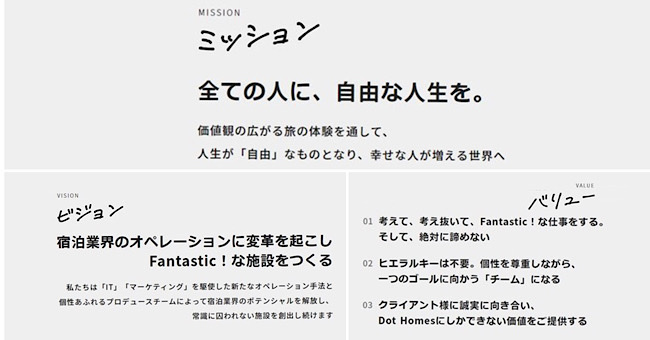 株式会社Dot Homes(本社:東京都品川区、代表取締役社長:留田 紫雲、以下Dot Homes)は、企業としての発展と宿泊業界への更なる貢献を目指し、「ミッション」「ビジョン」「バリュー(行動指針)」をリニューアルいたしました。