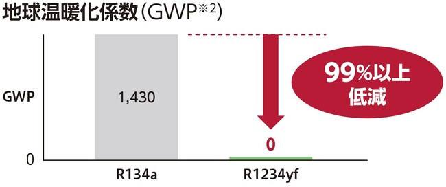 R1234yfは地球温暖化係数※1を従来の冷媒R134aに比べて99%以上低減した冷媒です。