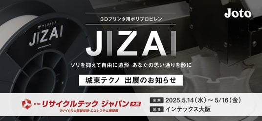 城東テクノ株式会社(本社:大阪府大阪市中央区 代表取締役:末久 泰朗)は、2025年5月14日(水)~16日(金)にインテックス大阪で開催される「リサイクルテックジャパン」に、3Dプリンタ用ポリプロピレン材料「JIZAI(ジザイ)」を出展いたします。