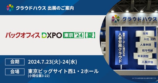 大企業向け人事労務クラウド『クラウドハウス労務』を運営する株式会社Techouse(本社所在地:東京都港区、代表取締役社長:礒邉 基之)は、2024年7月23日(火)から24日(水)まで開催される、管理部門の業務効率化・DX推進のための展示会「バックオフィスDXPO 東京’24」に出展いたします。