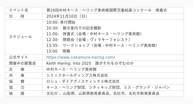 中村キース・ヘリング美術館(山梨県・小淵沢)は、第16回となる「中村キース・ヘリング美術館国際児童絵画コンクール」の授賞式を2024年11月10日(日)に開催します。ニューヨークのキース・ヘリング財団が認定する本コンクールは、アートを通して社会活動を行ったキース・ヘリングの遺志を受け継ぎ、自由な世界観を持つ子どもたちが、その想いを隔たりなく表現できる場を創出し、作品を通して子どもたちのメッセージを社会に伝えていくことを目的として2009年より毎年秋に開催しています。