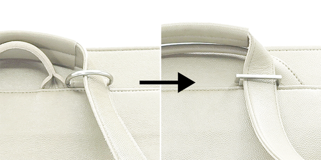 リュックを背負った時に背中へのフィット感が感じられるように金具を変更いたしました。ストラップの広がりを抑えています。