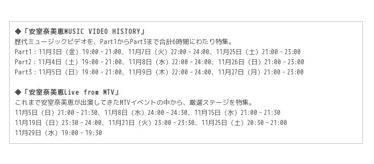 MTVは、安室奈美恵を11月のARTIST OF THE MONTH(MTVが1か月にわたり強力にプッシュするアーティスト)として、総力特集いたします。