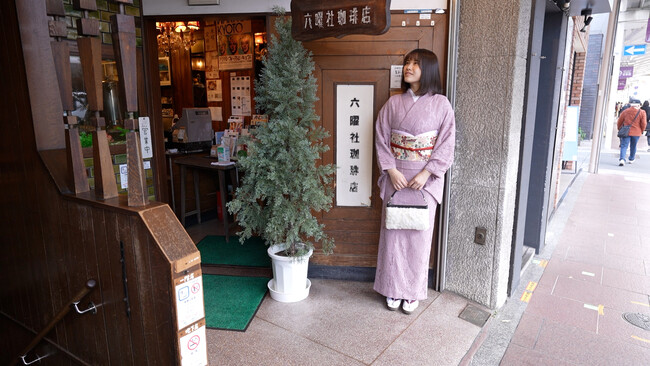 記念すべき第1回は、物語のはじまりの場所、第1話に登場する「六曜社珈琲店」におでかけ。モデルには、ミディアムボブのヘアスタイルと柔らかい笑顔が印象的な山口ことねさんを起用しています。『恋せよキモノ乙女』の作中では、主人公がおばあちゃんから譲り受けた着物を着るシーンが描かれていますが、今回のコーディネートにも、京都きもの友禅のスタッフが実際に祖母から譲り受けた帯を取り入れました。