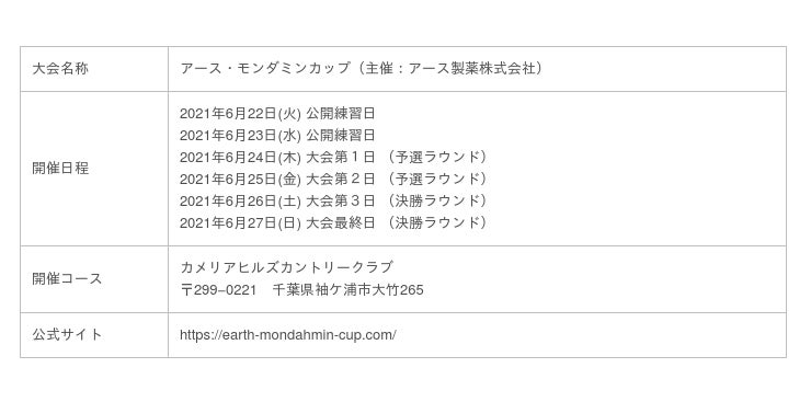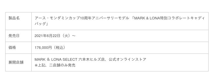 2021年度アース・モンダミンカップの開催週である2021年6月22日(火)~6月27日(日)にカメリアヒルズカントリークラブにて、MARK & LONAのコラボレート商品の販売が決定。10周年アニバーサリーモデルの「MARK & LONA特別コラボレートキャティバッグ」の展示販売や上記コラボパッケージ商品がブース内にてお求めいただけます。会場にいらした際には是非お立ち寄りください。(※チケットをお持ちの方のみ来場可能)