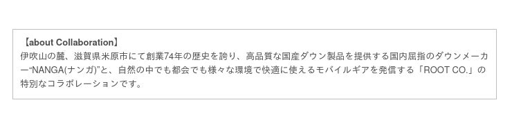 『NANGA×ROOT CO. AURORA 2.5LAYER TREK SHELL PARKA』『NANGA×ROOT CO. NO COLLAR SOFT DOWN CARDIGAN』は、NANGAの各プロダクトにROOT CO.ならではのギミック等を追加した別注モデルとなります。
