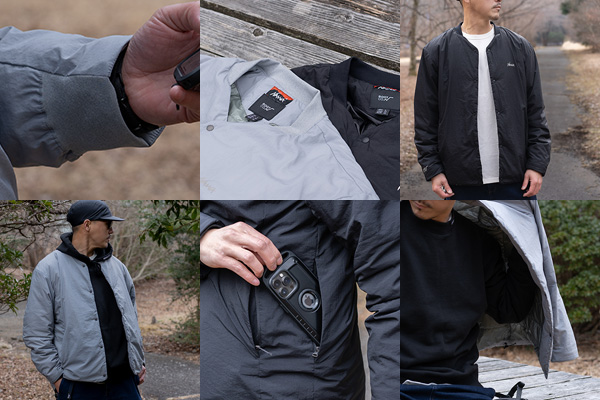 既存のフロントウエストポケットに加え、左右両サイドにジップポケットを追加。さらに2タイプのギアループも搭載。また、フロントジップをダブルファスナー仕様に変更し、胸元と袖口のロゴプリントはリフレクターとしました。