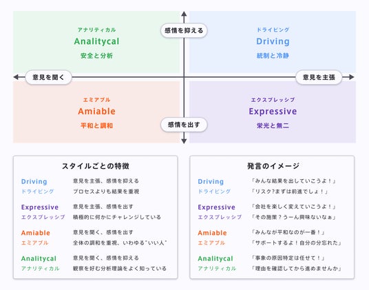 ソーシャルスタイル理論とは、1960年代に提唱されたコミュニケーションの理論です。人の言動である感情表現の強弱、意志主張の強弱によって、人材を4つのスタイルに分類し、各スタイルに適したコミュニケーションを行うことで円滑なコミュニケーションが行える理論として、様々な企業の教育研修などにも用いられています。人事業務や心理学の知識に疎い現場の管理職の方でも使えるシンプルな理論です。