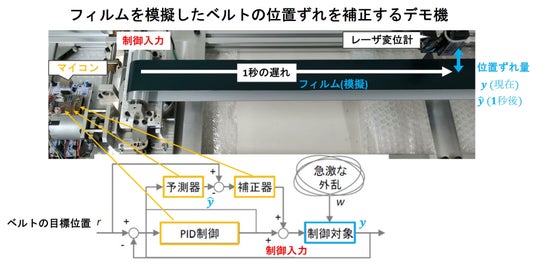 弊社は、省メモリでありながら、マイコン上で高速に推論可能な独自のエッジAIソフトウェアを開発・提供しております。本AIは、モーター制御や油圧制御などの生産機器の制御処理に活用でき、AIが制御指令値を補正する「AI-PID」技術を用いることで、生産機器の制御改善などに貢献します。なかでも、FA業界のフィルム巻取りなど、ウェブ搬送における蛇行制御装置をはじめとする遅れの大きな制御対象に対して有効です。従来、ウェブを送り出すためのローラーとの摩擦や搬送機自体の振動等の外乱により、搬送物の位置ずれが発生し、材料ロスにつながる課題がありましたが、弊社のAI技術を活用することで、この位置ずれを改善し、材料ロスの低減に貢献します。