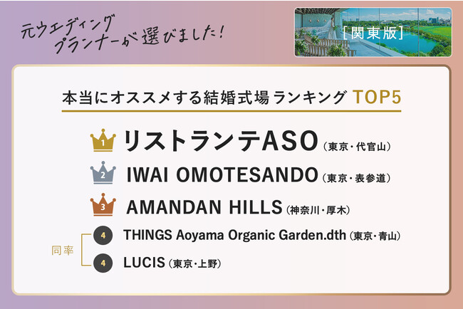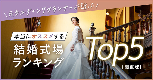 調査項目は、「接客/サービス」「自由度の高さ」「料理」「センス」「会場の雰囲気」の5項目で評価し、合計点が高い関東エリアのTOP5式場を発表します。