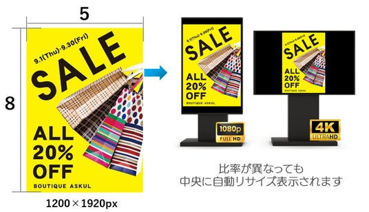 表示するディスプレイの解像度とは異なる解像度のコンテンツを表示する場合、アスペクト比を固定して、適正な表示になるように自動調整します。解像度を気にせずにパワーポイントで作成したコンテンツでも正常に表示することができます。