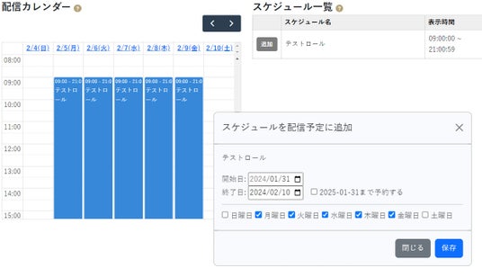 指定した期間、曜日、時間帯を設定できることで、期間限定キャンペーンの告知や、雨の日割引などの表示の切り替えをリアルタイムに行うことが可能です。運用担当者様のご要望を実現し、デジタルサイネージの広告効果最大化させることができます。