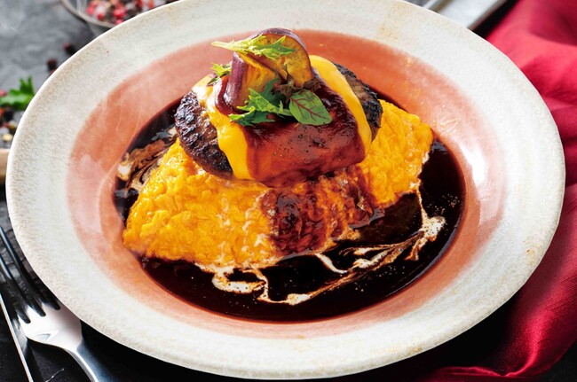 <ビーフと香味野菜の旨味と赤ワインの深いコク> < ハンバーグと深いコクのデミグラスソース>