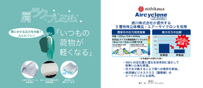 寝具メーカー西川株式会社の「立体形状をつくる高収縮糸」「96%の空気層を持つ繊維構想」「通気性に優れた」3層特殊立体構造のクッション材 「エアーサイクロン(※1)」をキッズリュックのショルダーパッドへ内蔵し、 日本睡眠科学研究所にて実施した圧力分散試験ではF・O・インターナショナル従来品よりも最大圧力で約58%の軽減に成功いたしました。