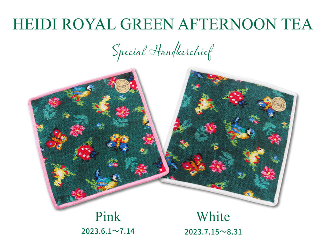 「 #ハイジロイヤルグリーンアフタヌーンティー 」では、アフタヌーンティーに、ホテルニューオータニオリジナルのハイジロイヤルグリーンハンカチ1枚(約25×25cm)とコラボレーションドリンクを付けてご用意いたします。