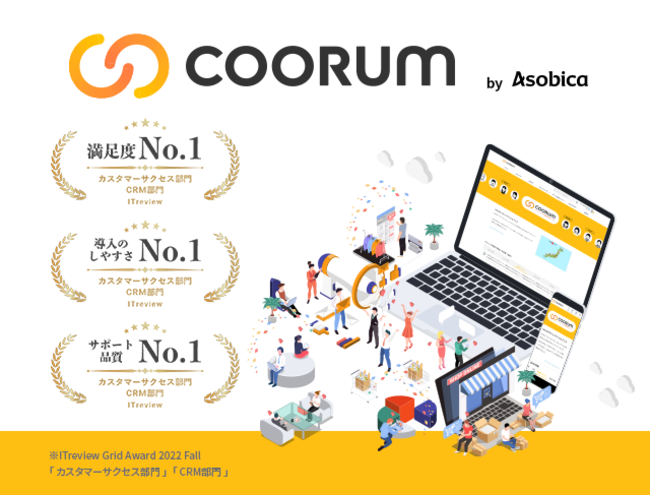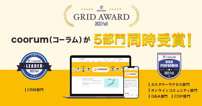 株式会社Asobica(本社所在地:東京都品川区、以下「当社」)が提供するロイヤル顧客プラットホーム「coorum(コーラム)」が、「ITreview Grid Award 2022 Fall」のCRM部門において「Leader」を受賞し、カスタマーサクセス部門・オンラインコミュニティ部門・CDP部門・Q&A部門において「HIGH PERFORMER」を受賞したことを発表いたします。
