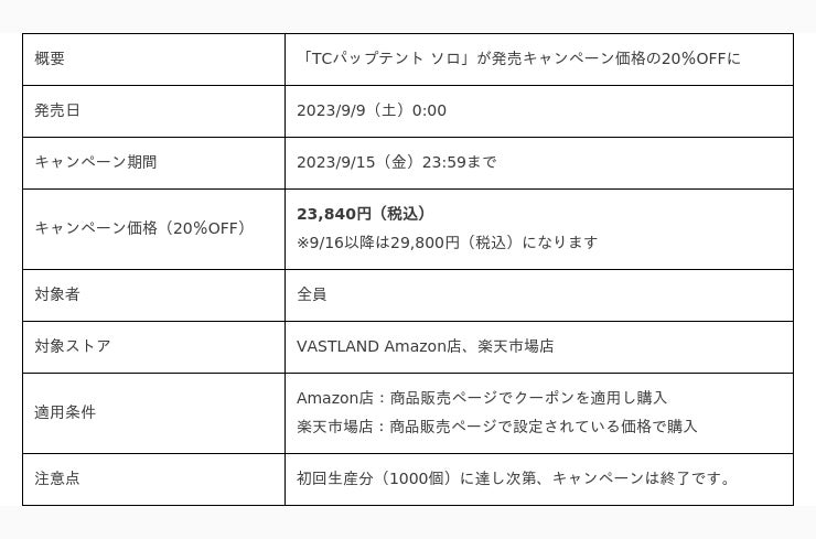 VASTLAND株式会社(本社:兵庫県姫路市/代表:田中悠貴)が運営するキャンプギアブランド「VASTLAND(ヴァストランド)」は、テントの近くで焚き火を楽しむことができるオールシーズン対応の「TCパップテント ソロ」を2023/9/9(土)にAmazon店&楽天市場店で先行発売することを決定しました。また発売を記念して、Amazon店&楽天市場店限定で20%OFFの価格で購入できる「発売キャンペーン」を【初回生産分1000個限定】で開催します。