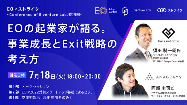 EO ― Entrepreneurs’ Organizationの世界最大級のチャプター(支部)であるEO Tokyo Centralが主催するアクセラレートプログラム「EO Tokyo Central INNOVATION PROGRAM 2022」(以下、EOIP2022)と、S venture Lab.のコラボによる特別イベントを7月18日(火)に開催いたします。
