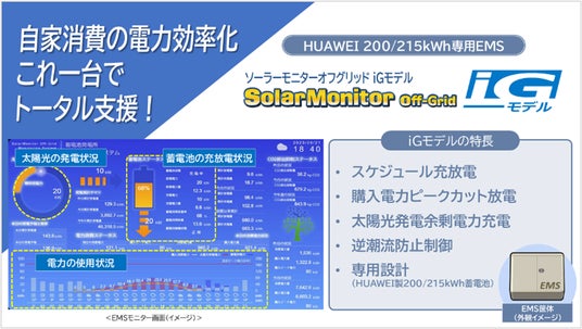 株式会社イグアス(本社:神奈川県川崎市、代表取締役社長:矢花達也、以下イグアス)は、エナジー・ソリューションズ株式会社(本社:東京都千代田区、代表取締役社長:森上寿生、以下ESI社)と協業し、ESI社が開発・提供する新製品、HUAWEI製200/215kWh蓄電池専用EMS「SolarMonitor Off-Grid[iGモデル]」(ソーラーモニターオフグリッド アイジーモデル)を、2026年3月16日より販売開始します。