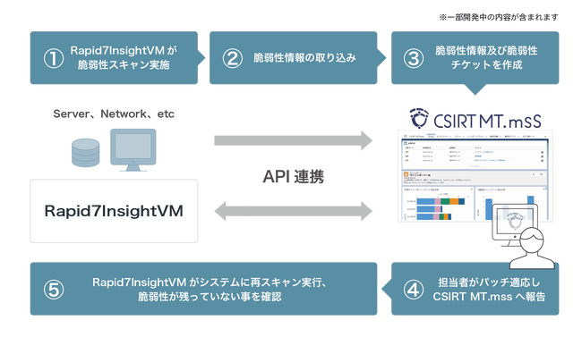 「CSIRT MT.mss」は、CSIRTやSOCの運用に最適化したマルチテナント型セキュリティマネジメントサービスであり、「Rapid7InsightVM」はクラウド、IoTなども含む多様なIT資産を継続的にスキャンし常にそのリスクを可視化するクラウド型脆弱性管理プラットフォームです。今回リリースした連携機能では「Rapid7InsightVM」がスキャンを実施し発見した脆弱性および資産情報を、API連携によって「CSIRT MT.mss」へ自動で取り込み、脆弱性情報とその対応状況のチケット管理を可能にしました。この連携により脆弱性の適切な把握と確実な対応管理を実現し、ユーザーのセキュリティリスク管理の高度化を支援します。