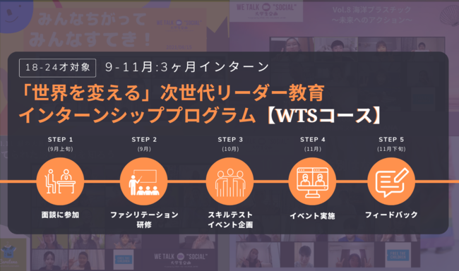 オンラインイベント「WE Talk "SOCIAL"(WTS)」は、小学生から大学生までの様々な世代が参加して社会問題について学び、語り合うイベント。11月の開催を目標に、それぞれが取り組むイベントのテーマ探しからプログラムの構成、参加者の募集やケア、プレゼン資料の作成、司会進行など、一連のオンラインイベントの運営スキルを習得します。