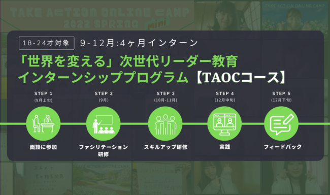 認定NPO法人フリー・ザ・チルドレン・ジャパン(所在地:東京都世田谷区南烏山6-6-5-3F、代表:中島早苗)は、18歳~24歳を対象にした無料オンライン研修「次世代リーダー教育インターンシッププログラム」参加者の募集を開始しました。当団体が実施している数日間にわたる小中高校生向けオンラインキャンプ「テイク・アクション・オンライン・キャンプ(TAOC)」でのファシリテーション担当を担うコースと、社会問題についてプレゼンやディスカッションなどを行うオンラインイベント「WE Talk "SOCIAL"(WTS)」の企画・運営を目指すコースの2コースで募集します。