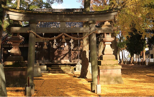 加賀国の武士、富樫家国が野々市に館を構えた際、敷地内に造営したとされる神社です。弁慶が富樫氏の館で投げ飛ばしたと伝わる大石「弁慶の力石」が境内におかれていて、干ばつの際に担ぎ回ると必ず雨が降ったという伝説から、「雨乞石」とも呼ばれています。敷地内には樹齢500年の大公孫樹(おおいちょう)が見られ、秋には黄色い絨毯が境内を彩ります。